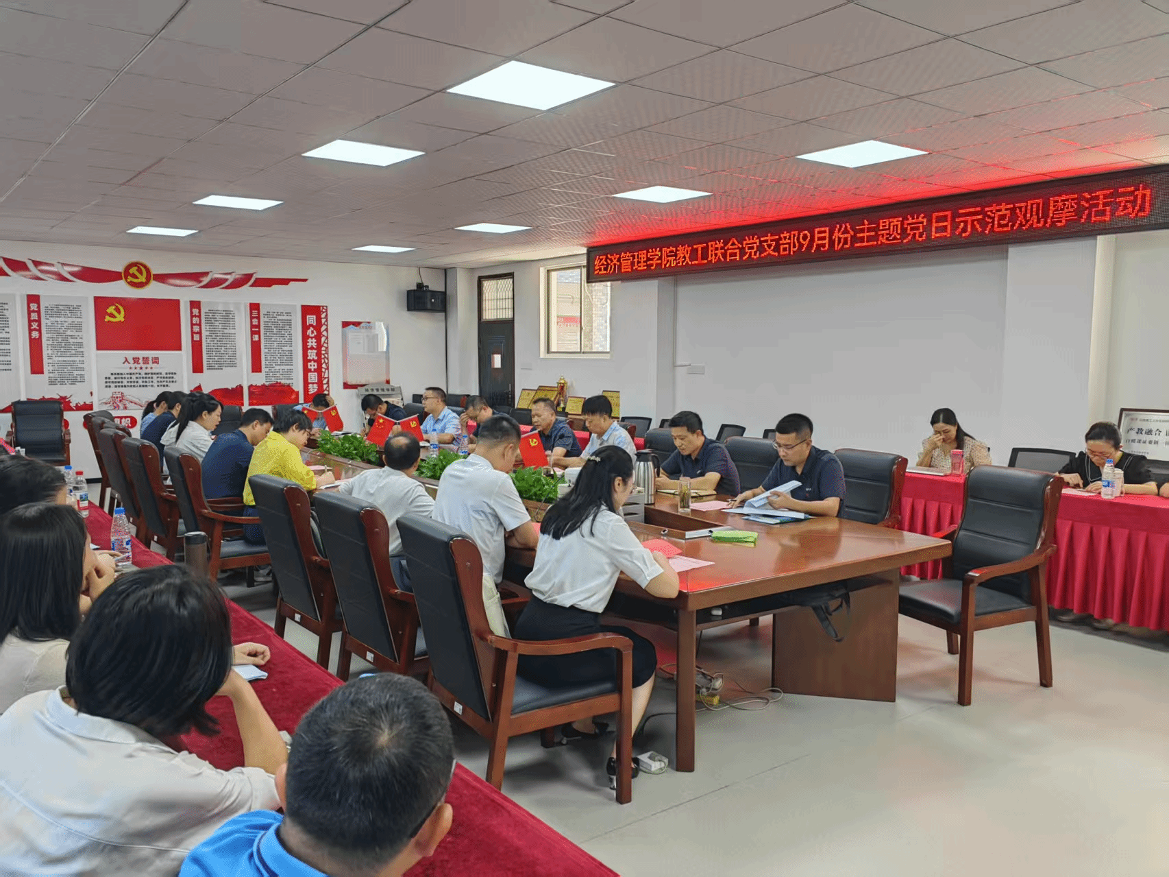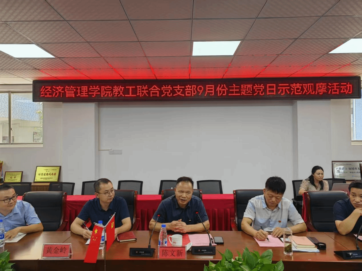 本网讯:为深入学习贯彻习近平总书记重要讲话精神,大力弘扬教育家精神,强化教师队伍建设,9月28日上午,经管学院教工第一、第二党支部在学院305会议室联合开展了“以教育家精神强师铸魂,谱写教育强国建设华章”为主题的主题党日示范观摩活动。williamhill英国党委委员、纪委书记陈文新出席活动,学校相关职能部门及各二级学院观摩同志,william威廉英国教工第一、第二党支部全体党员共同参与,活动由学院教工第一党支部书记黄金岭主持。