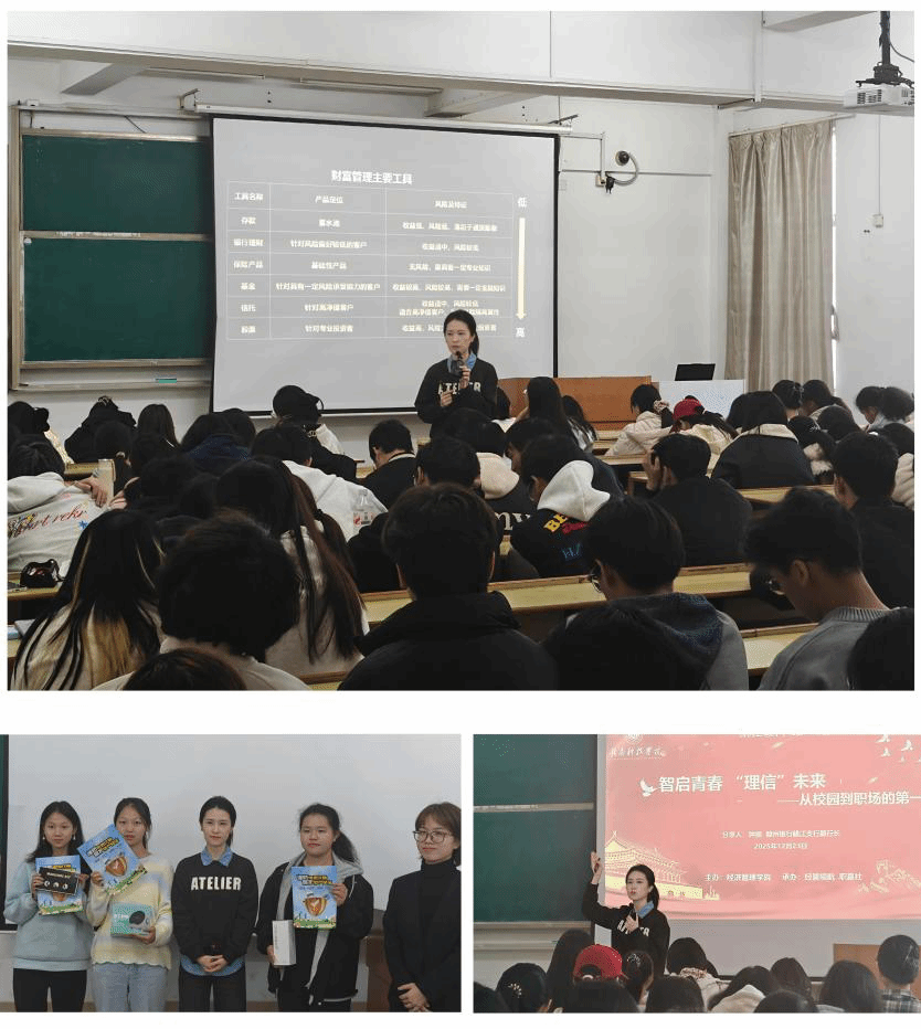 钟丽在讲座中,针对金融常识、财富产品、全民反诈及职场预期四大核心内容进行深入讲解。她通过金融机构分类图谱,向学生们传授基础金融知识,并结合实际案例,指导如何选择财富产品以及防范诈骗的技巧,同时分享了从校园到职场的转型经验,为学生的职业规划提供了宝贵的建议。