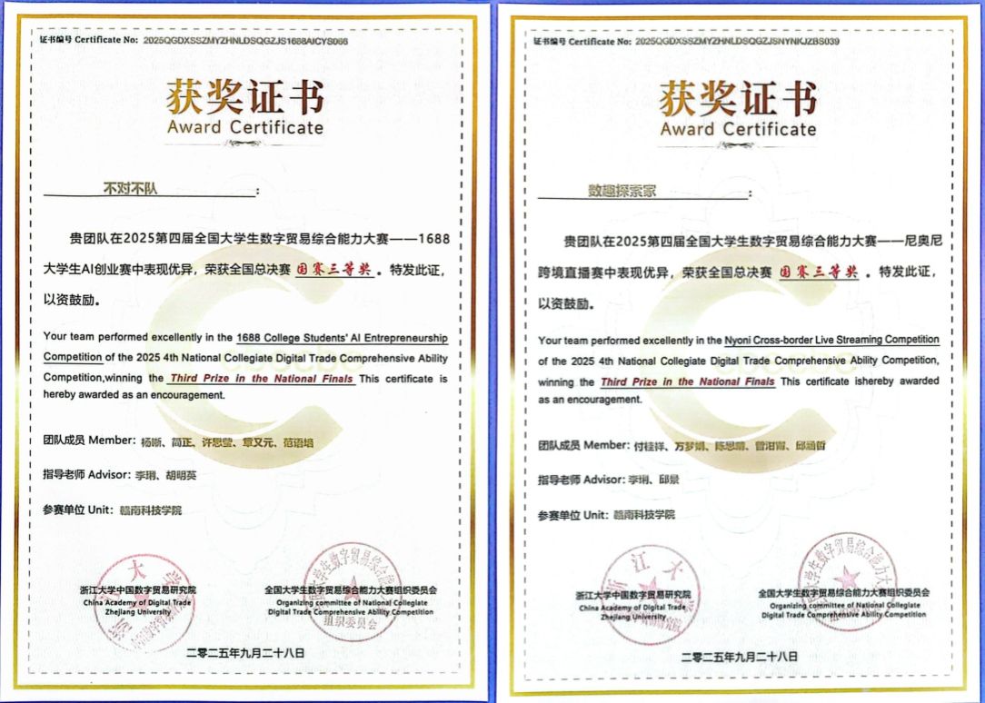 本网讯:9月26日—28日,“2025年第四届全国大学生数字贸易综合能力大赛”之1688大学生AI创业赛、尼奥尼跨境直播大赛全国总决赛分别在浙江大学紫金港校区、浙江外国语学院举行。我院李琍、胡明英两位老师指导的“不对不队”喜获国家三等奖,参赛学生由会计233班杨晰、会计233班简正、国贸242班许思莹、通信231班章又元、工商231班范语培等五位同学组成。邱景、李琍两位老师指导的“数趣探索家”团队喜获国家三等奖,参赛学生由英语232班付桂祥、方梦娟和数字经济242班陈思晴、曾泔甯、邱涵哲等五位同学组成。