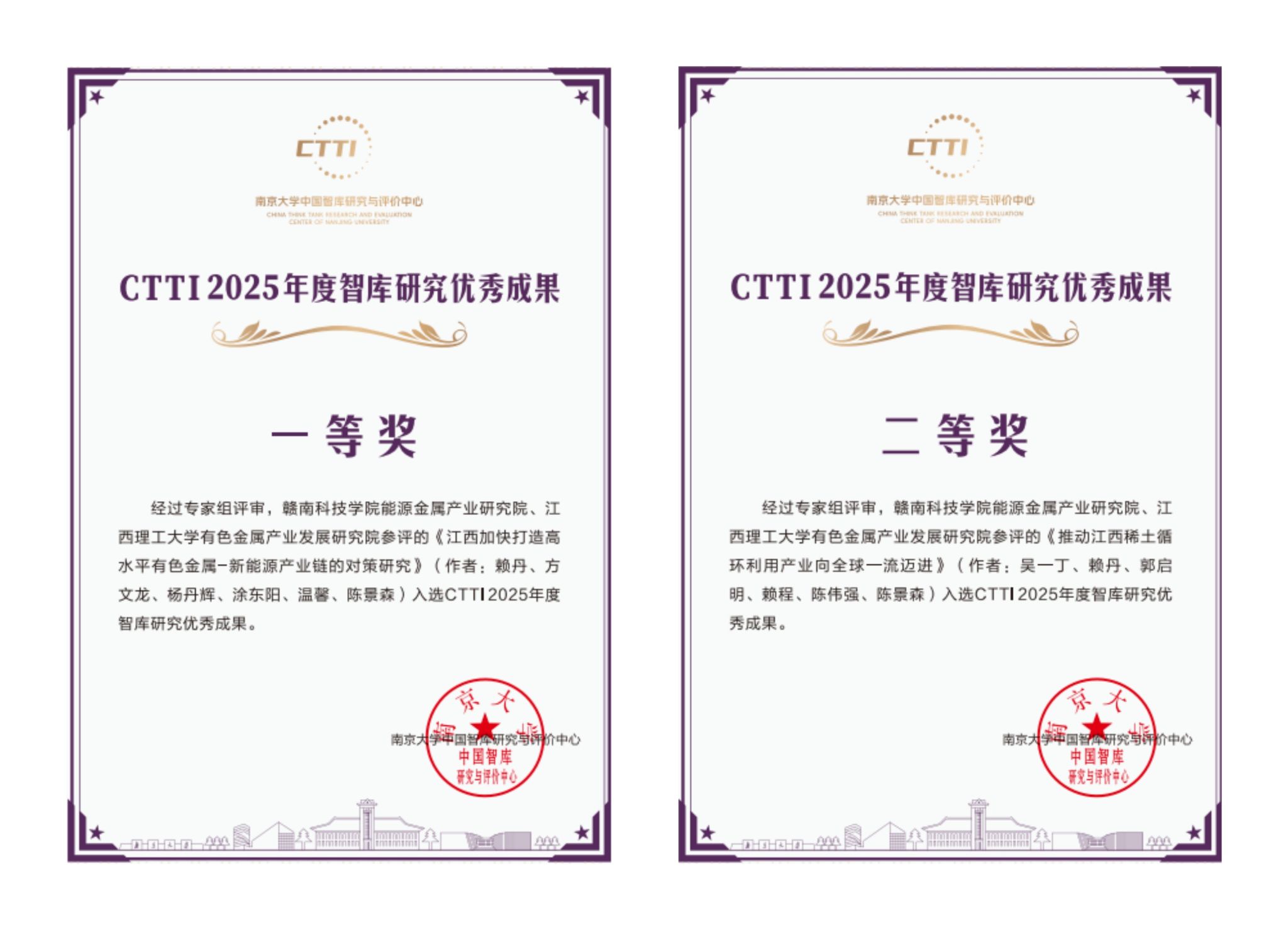 本网讯:11月21日,由南京大学主办、南京大学中国智库研究与评价中心承办的“2025新型智库治理论坛”在江苏南京市隆重召开。来自国家高端智库、高校智库、智库管理部门等的专家学者500余人参会。论坛发布了2025年度CTTI智库优秀研究成果。我校能源金属产业研究院团队成员受邀参会,研究院执行院长赖丹教授、首席专家吴一丁教授提交的智库成果分别获得智库优秀成果一等奖和二等奖。